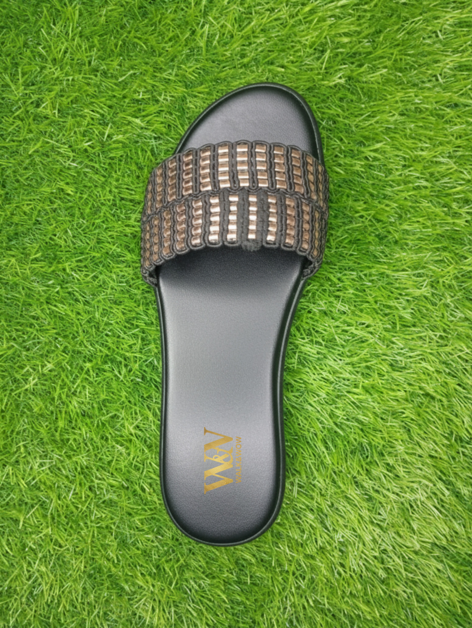 Design: Wide textured strap featuring a metallic bronze weave pattern.